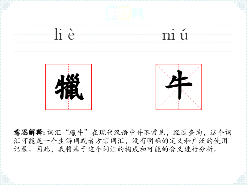 词汇“犣牛”在现代汉语中并不常见,经过查询,这个词汇可能是一个生僻词或者方言词汇,没有明确的定义和广泛的使用记录。因此,我将基于这个词汇的构成和可能的含义进行分析。