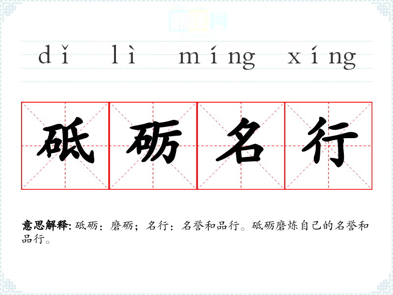 砥砺:磨砺;名行:名誉和品行。砥砺磨炼自己的名誉和品行。