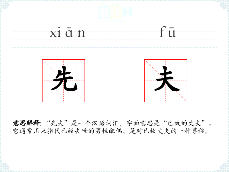 “先夫”是一个汉语词汇,字面意思是“已故的丈夫”。它通常用来指代已经去世的男性配偶,是对已故丈夫的一种尊称。
