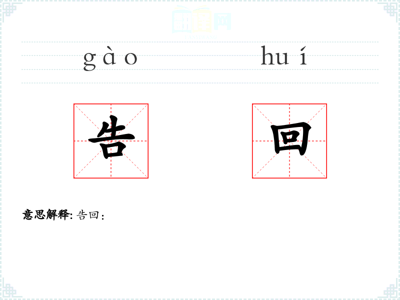 - 词源:告回由两个古汉语词汇组成,告(告知)和回(返回)。