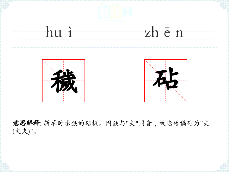 斩草时承鈇的砧板。因鈇与"夫"同音﹐故隐语稿砧为"夫(丈夫)"。