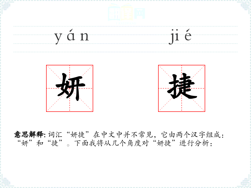 词汇“妍捷”在中文中并不常见,它由两个汉字组成:“妍”和“捷”。下面我将从几个角度对“妍捷”进行分析: