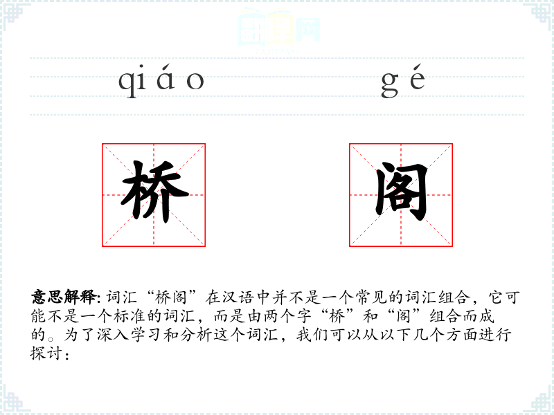 词汇“桥阁”在汉语中并不是一个常见的词汇组合,它可能不是一个标准的词汇,而是由两个字“桥”和“阁”组合而成的。为了深入学*和分析这个词汇,我们可以从以下几个方面进行探讨: