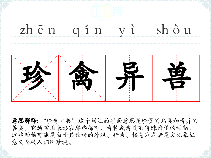 “珍禽异兽”这个词汇的字面意思是珍贵的鸟类和奇异的兽类。它通常用来形容那些稀有、奇特或者具有特殊价值的动物,这些动物可能是由于其独特的外观、行为、栖息地或者是文化象征意义而被人们所珍视。