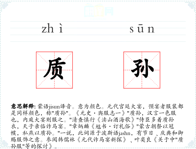 1.蒙语jisun译音。意为颜色。元代宫廷大宴,预宴者服装都是同样颜色,称"质孙"。《元史·舆服志一》"质孙,汉言一色服也,内庭大宴则服之。"清查慎行《渎山酒海歌》"侍臣多着质孙衣,天子亲临诈马宴。"章炳麟《訄书·订礼俗》"蒙古朝祭以冠幞,私燕以质孙。"一说,此词源于波斯语jashn,有节日﹑庆典和御赐服饰之意。参阅韩儒林《元代诈马宴新探》﹑叶奕良《关于中"质孙服"等的探讨》。