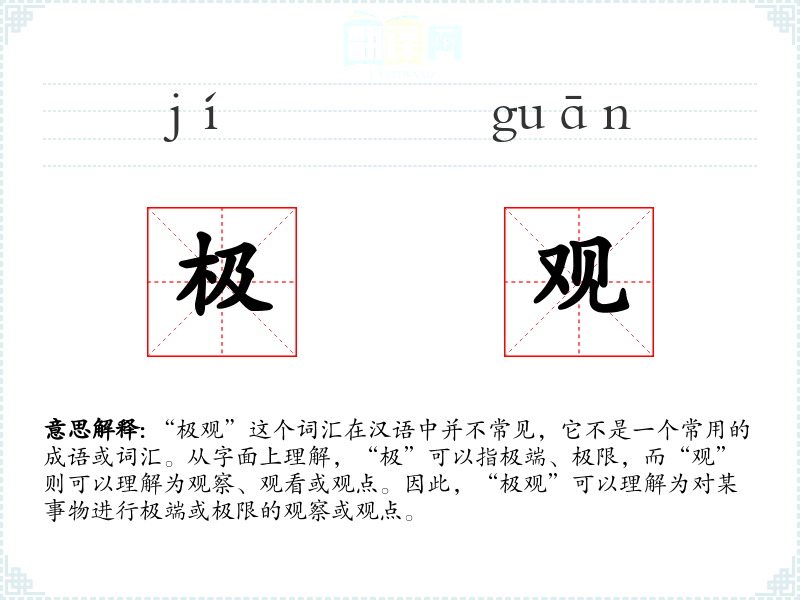 “极观”这个词汇在汉语中并不常见,它不是一个常用的成语或词汇。从字面上理解,“极”可以指极端、极限,而“观”则可以理解为观察、观看或观点。因此,“极观”可以理解为对某事物进行极端或极限的观察或观点。