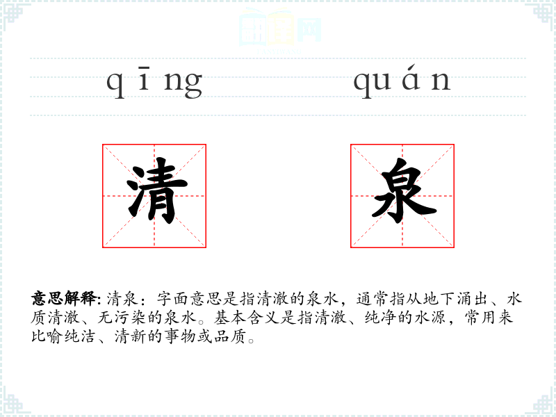清泉:字面意思是指清澈的泉水,通常指从地下涌出、水质清澈、无污染的泉水。基本含义是指清澈、纯净的水源,常用来比喻纯洁、清新的事物或品质。