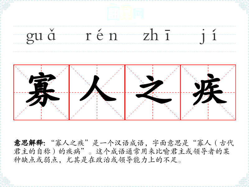 “寡人之疾”这个成语源自**古代文献,特别是在描述历史上的君主和他们的统治时。随着时间的推移,这个成语的意义和用法有所扩展,但核心含义始终围绕着领导者的缺点和不足。