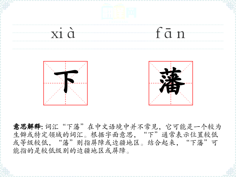 - 词源:“下”和“藩”都是古代汉语词汇,分别表示位置和屏障。
