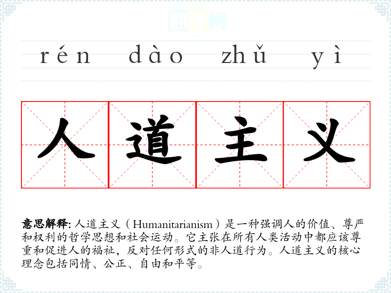 人道主义(Humanitarianism)是一种强调人的价值、尊严和权利的哲学思想和社会**。它主张在所有人类活动中都应该尊重和促进人的福祉,反对任何形式的非人道行为。人道主义的核心理念包括同情、公正、自由和平等。