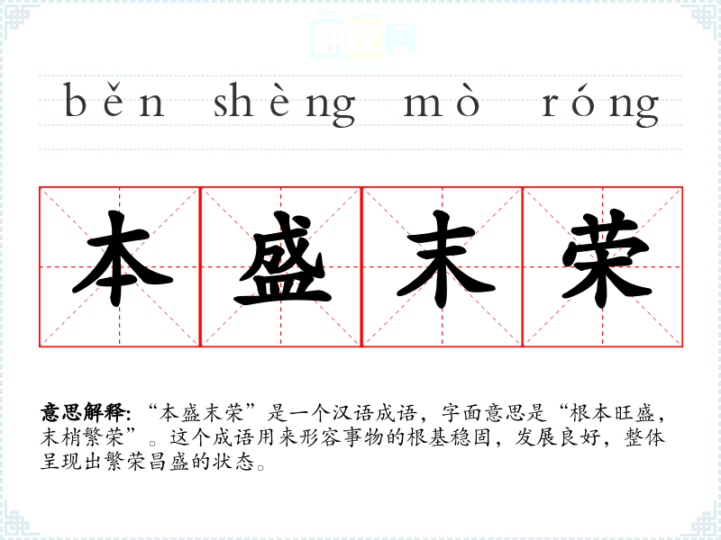 “本盛末荣”是一个汉语成语,字面意思是“根本旺盛,末梢繁荣”。这个成语用来形容事物的根基稳固,发展良好,整体呈现出繁荣昌盛的状态。