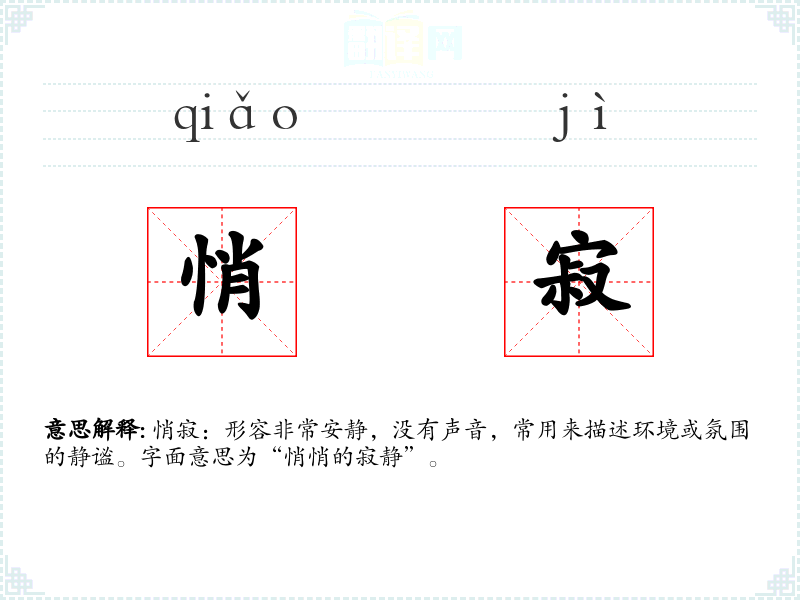 悄寂:形容非常安静,没有声音,常用来描述环境或氛围的静谧。字面意思为“悄悄的寂静”。
