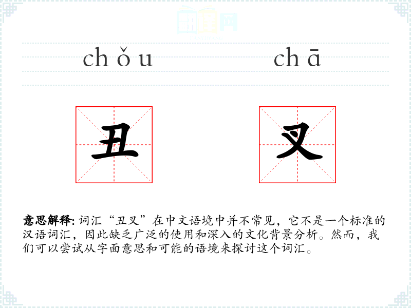 词汇“丑叉”在中文语境中并不常见,它不是一个标准的汉语词汇,因此缺乏广泛的使用和深入的文化背景分析。然而,我们可以尝试从字面意思和可能的语境来探讨这个词汇。
