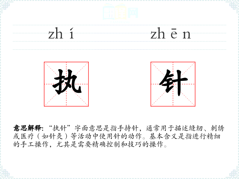 - 口语:在日常对话中,“执针”可能直接指代缝纫或刺绣的动作,如“她正在房间里执针缝补衣服”。
