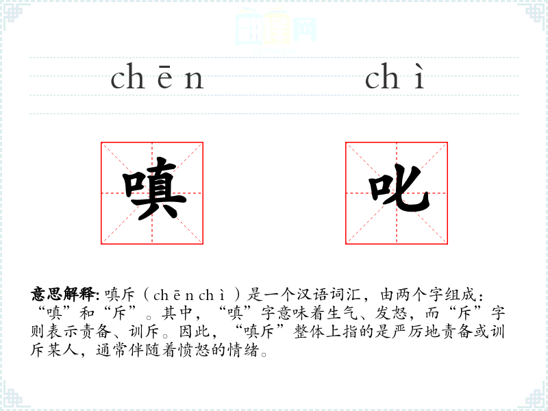 嗔斥(chēn chì)是一个汉语词汇,由两个字组成:“嗔”和“斥”。其中,“嗔”字意味着生气、发怒,而“斥”字则表示责备、训斥。因此,“嗔斥”整体上指的是严厉地责备或训斥某人,通常伴随着愤怒的情绪。