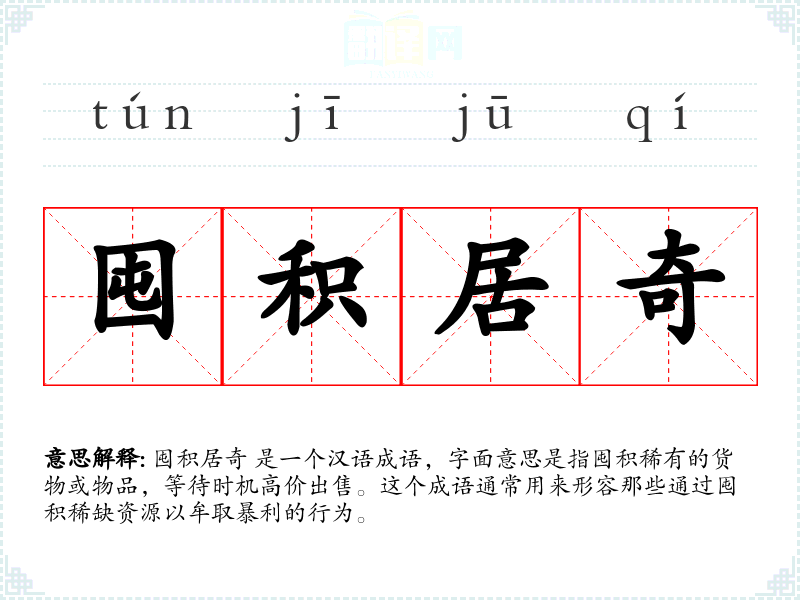 囤积居奇 是一个汉语成语,字面意思是指囤积稀有的货物或物品,等待时机高价出售。这个成语通常用来形容那些通过囤积稀缺资源以牟取暴利的行为。