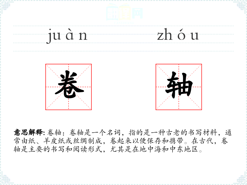 卷轴:卷轴是一个名词,指的是一种古老的书写材料,通常由纸、羊皮纸或丝绸制成,卷起来以便保存和携带。在古代,卷轴是主要的书写和阅读形式,尤其是在地中海和中东地区。