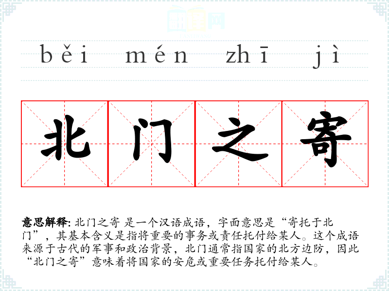 北门之寄 是一个汉语成语,字面意思是“寄托于北门”,其基本含义是指将重要的事务或责任托付给某人。这个成语来源于古代的军事和政治背景,北门通常指国家的北方边防,因此“北门之寄”意味着将国家的安危或重要任务托付给某人。