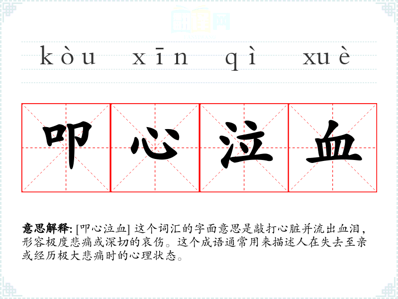 [叩心泣血] 这个词汇的字面意思是敲打心脏并流出血泪,形容极度悲痛或深切的哀伤。这个成语通常用来描述人在失去至亲或经历极大悲痛时的心理状态。