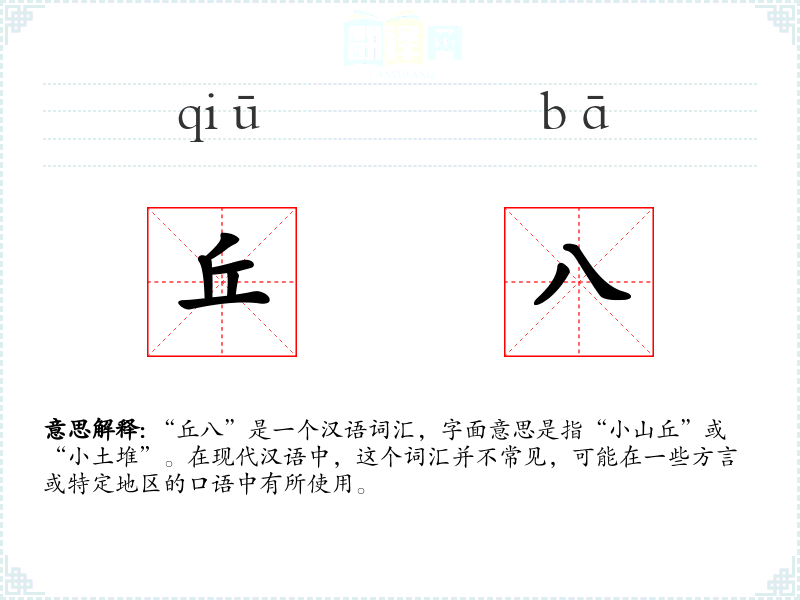 “丘八”是一个汉语词汇,字面意思是指“小山丘”或“小土堆”。在现代汉语中,这个词汇并不常见,可能在一些方言或特定地区的口语中有所使用。