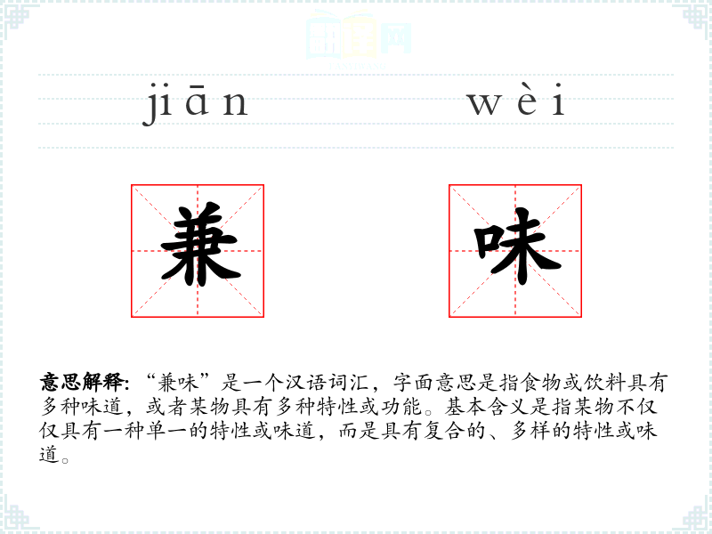 “兼味”是一个汉语词汇,字面意思是指食物或饮料具有多种味道,或者某物具有多种特性或功能。基本含义是指某物不仅仅具有一种单一的特性或味道,而是具有复合的、多样的特性或味道。