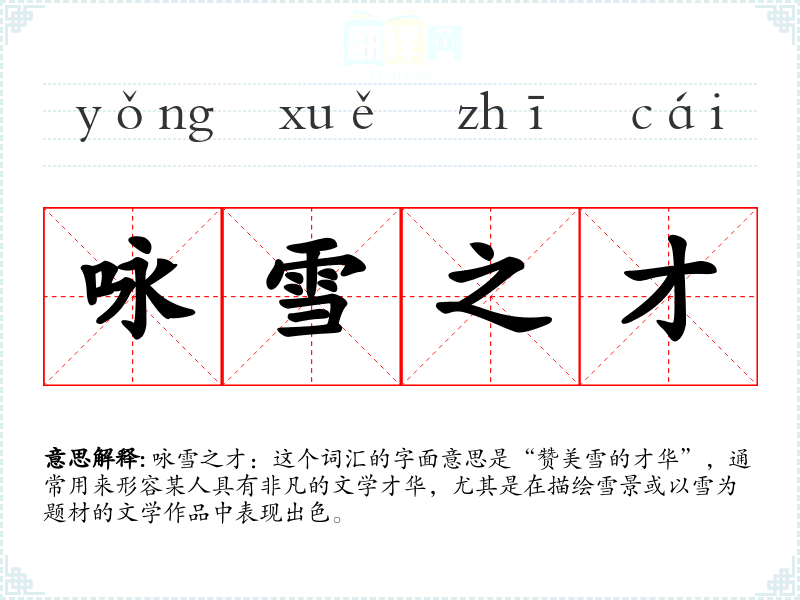 咏雪之才:这个词汇的字面意思是“赞美雪的才华”,通常用来形容某人具有非凡的文学才华,尤其是在描绘雪景或以雪为题材的文学作品中表现出色。