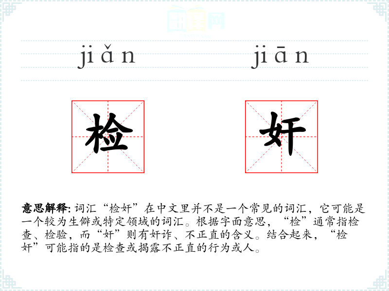 - 词源:可能源自古代汉语,其中“检”和“奸”各自有悠久的历史。