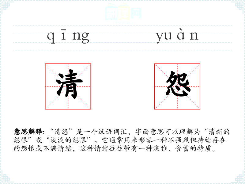 “清怨”这个词汇的词源较为传统,它继承了古代汉语中对情感细腻描写的传统。随着时间的推移,这个词汇的使用范围和含义可能有所变化,但基本上保持了其原有的情感色彩。