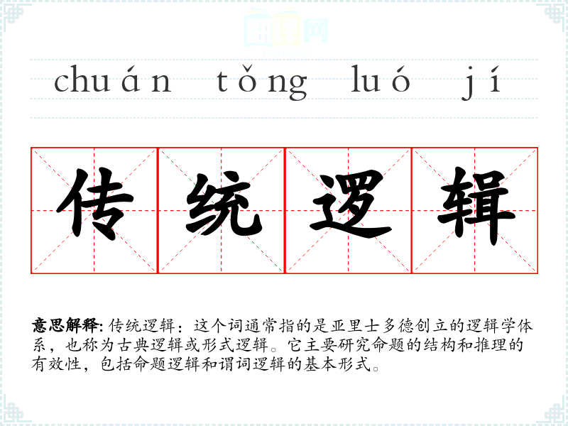 传统逻辑:这个词通常指的是亚里士多德创立的逻辑学体系,也称为古典逻辑或形式逻辑。它主要研究命题的结构和推理的有效性,包括命题逻辑和谓词逻辑的基本形式。
