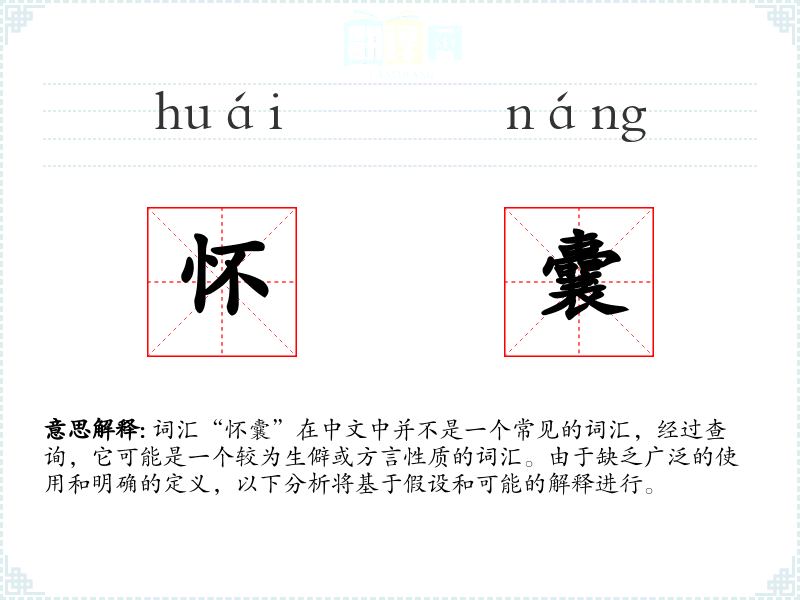 词汇“怀囊”在中文中并不是一个常见的词汇,经过查询,它可能是一个较为生僻或方言性质的词汇。由于缺乏广泛的使用和明确的定义,以下分析将基于假设和可能的解释进行。