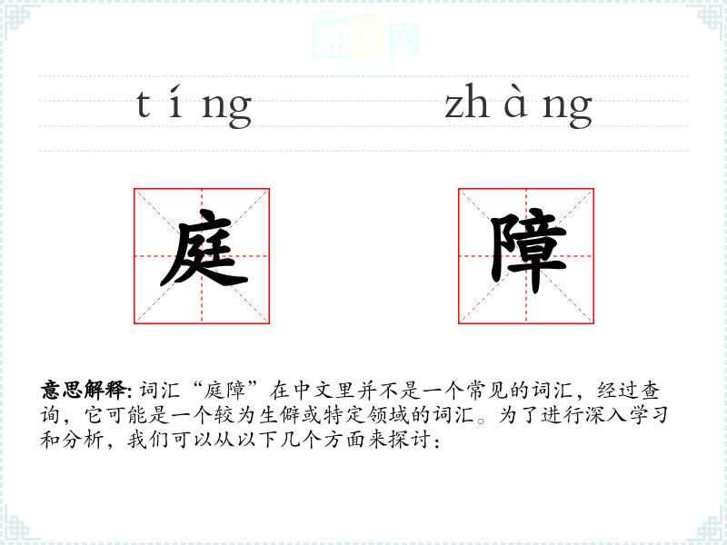 词汇“庭障”在中文里并不是一个常见的词汇,经过查询,它可能是一个较为生僻或特定领域的词汇。为了进行深入学*和分析,我们可以从以下几个方面来探讨: