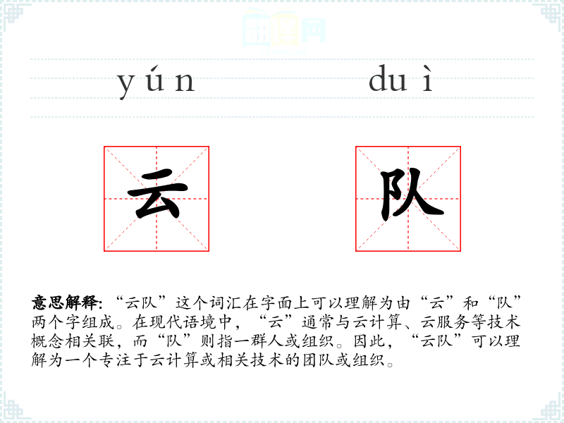 “云队”这个词汇是随着云计算技术的发展而新兴的。它结合了“云”这一现代技术概念和“队”这一传统组织形式,反映了技术与组织的结合。