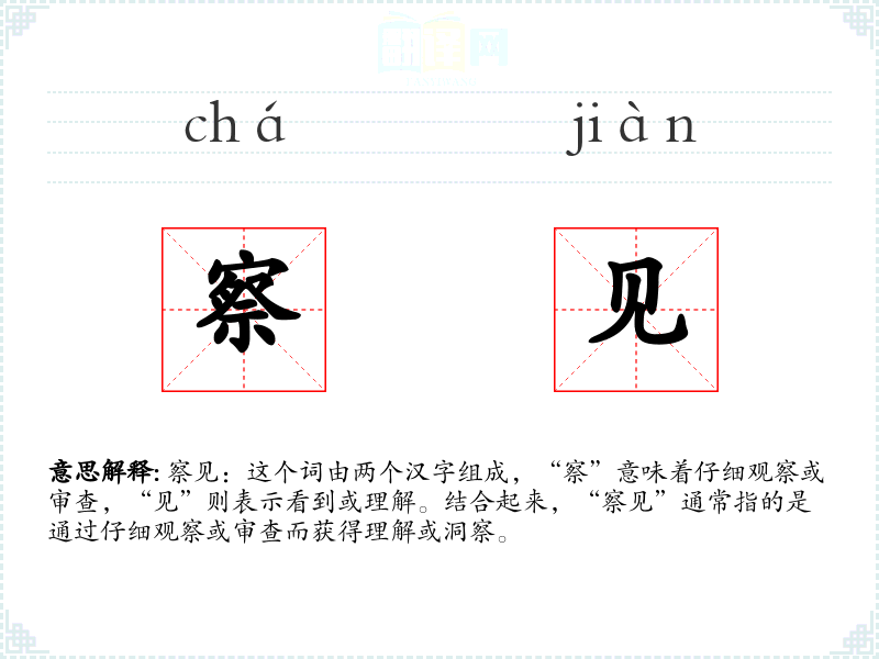 察见:这个词由两个汉字组成,“察”意味着仔细观察或审查,“见”则表示看到或理解。结合起来,“察见”通常指的是通过仔细观察或审查而获得理解或洞察。