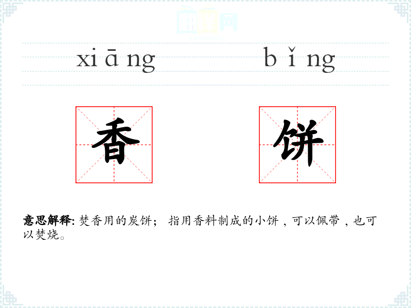 焚香用的炭饼; 指用香料制成的小饼﹐可以佩带﹐也可以焚烧。
