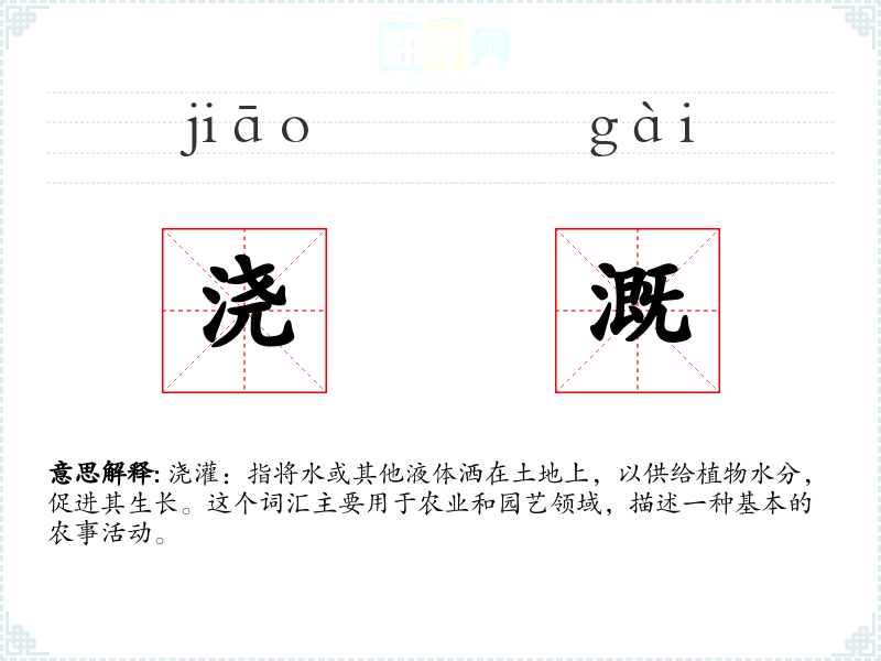 浇灌:指将水或其他液体洒在土地上,以供给植物水分,促进其生长。这个词汇主要用于农业和园艺领域,描述一种基本的农事活动。