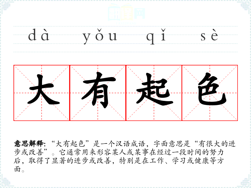 - 口语:在日常对话中,人们常用“大有起色”来表达对某人进步的赞赏,如“经过这段时间的努力,他的英语水平大有起色。”