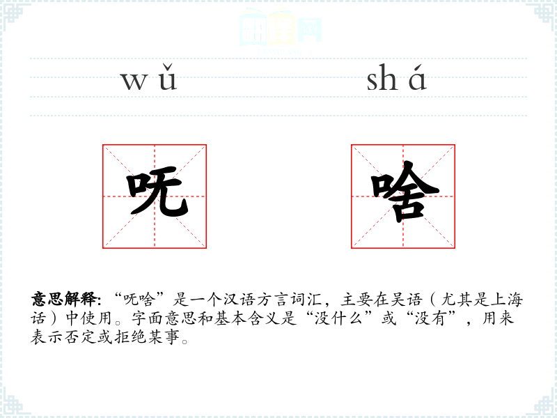 “呒啥”是一个汉语方言词汇,主要在吴语(尤其是上海话)中使用。字面意思和基本含义是“没什么”或“没有”,用来表示否定或拒绝某事。