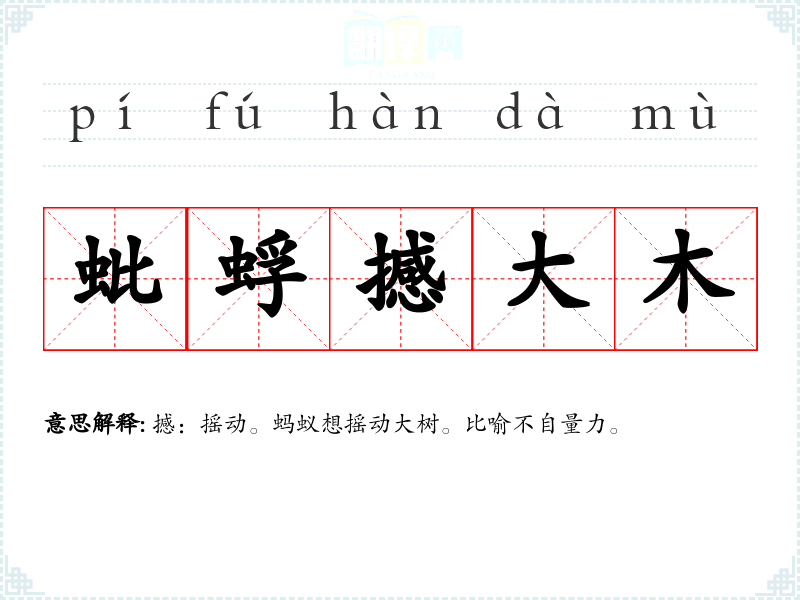 撼:摇动。蚂蚁想摇动大树。比喻