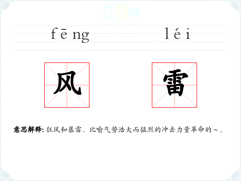 狂风和暴雷。比喻气势浩大而猛烈的冲击力量革命的~。