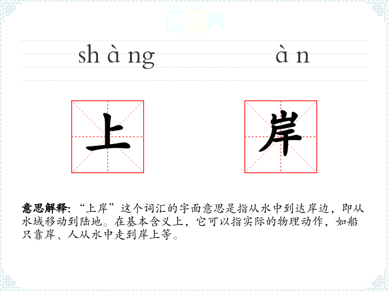 "上岸"的意思解释、上岸是什么意思由翻译网汉语词典查词提供。