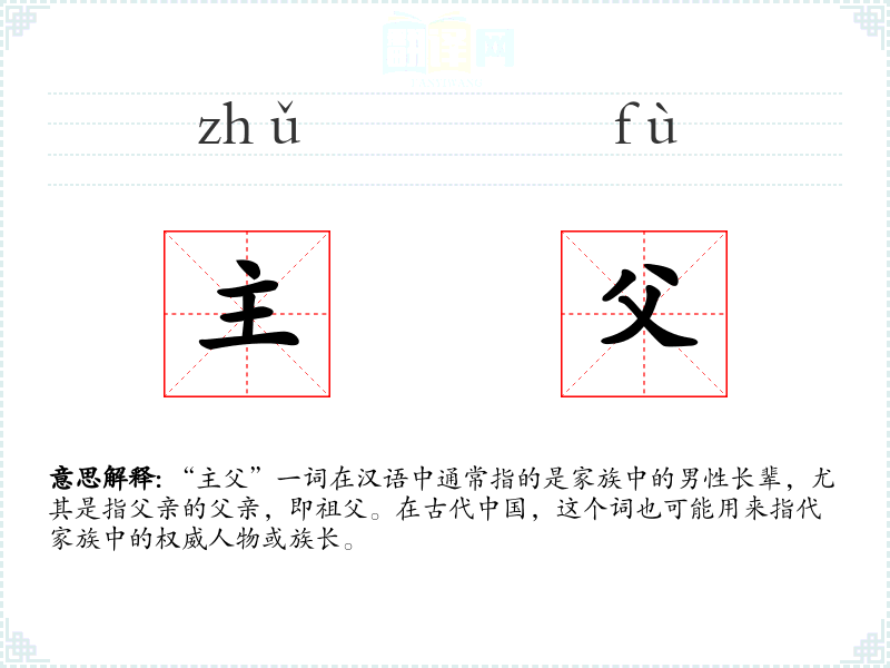 “主父”一词在汉语中通常指的是家族中的男性长辈,尤其是指父亲的父亲,即祖父。在古代**,这个词也可能用来指代家族中的权威人物或族长。