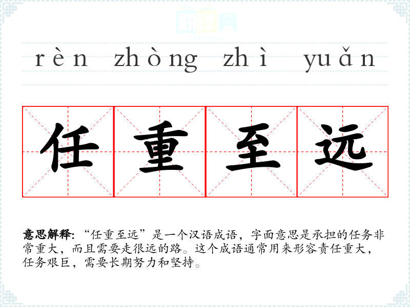 “任重至远”是一个汉语成语,字面意思是承担的任务非常重大,而且需要走很远的路。这个成语通常用来形容责任重大,任务艰巨,需要长期努力和坚持。