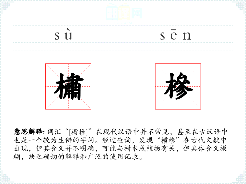 由于“槚槮”不是一个常用词汇,其字面意思和基本含义难以确定。在古代文献中,它可能指某种树木或植物,但具体是哪一种,以及其确切的生物学特征,目前没有明确的资料可以参考。