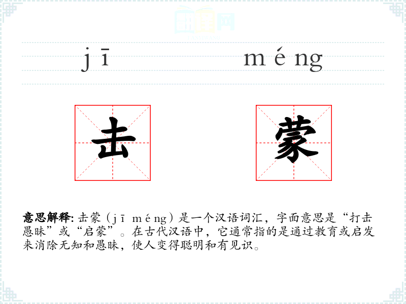 击蒙(jī méng)是一个汉语词汇,字面意思是“打击愚昧”或“启蒙”。在古代汉语中,它通常指的是通过教育或启发来消除无知和愚昧,使人变得聪明和有见识。