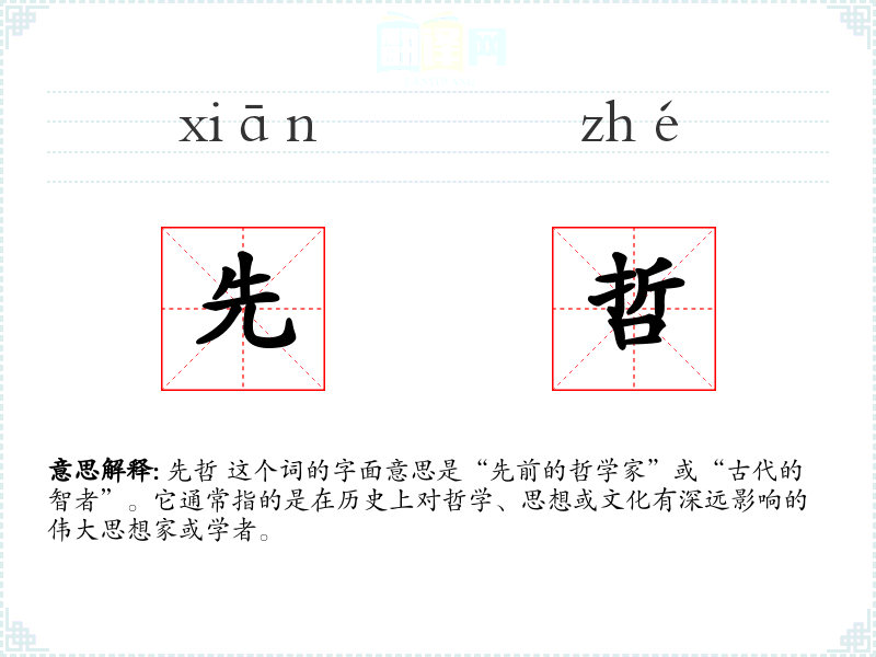 先哲 这个词的字面意思是“先前的哲学家”或“古代的智者”。它通常指的是在历史上对哲学、思想或文化有深远影响的伟大思想家或学者。