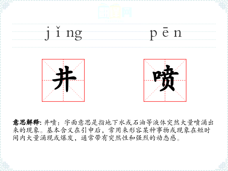井喷:字面意思是指地下水或石油等液体突然大量喷涌出来的现象。基本含义在引申后,常用来形容某种事物或现象在短时间内大量涌现或爆发,通常带有突然性和强烈的动态感。
