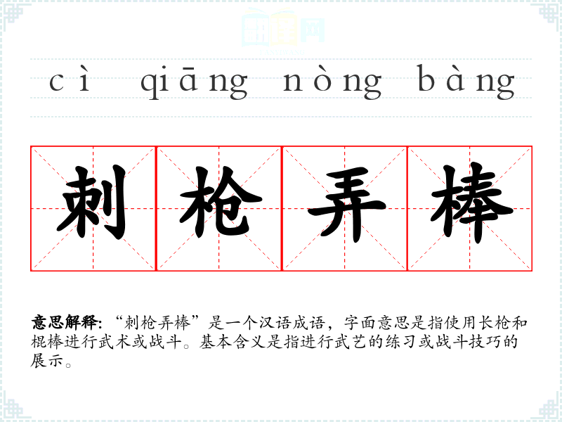 “刺枪弄棒”是一个汉语成语,字面意思是指使用长枪和棍棒进行武术或战斗。基本含义是指进行武艺的练*或战斗技巧的展示。