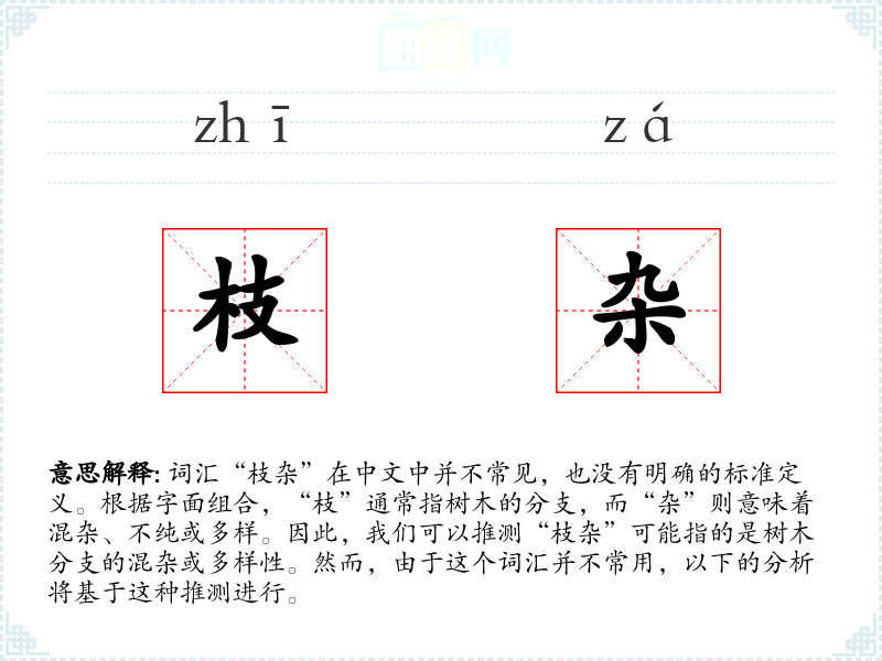 词汇“枝杂”在中文中并不常见,也没有明确的标准定义。根据字面组合,“枝”通常指树木的分支,而“杂”则意味着混杂、不纯或多样。因此,我们可以推测“枝杂”可能指的是树木分支的混杂或多样性。然而,由于这个词汇并不常用,以下的分析将基于这种推测进行。