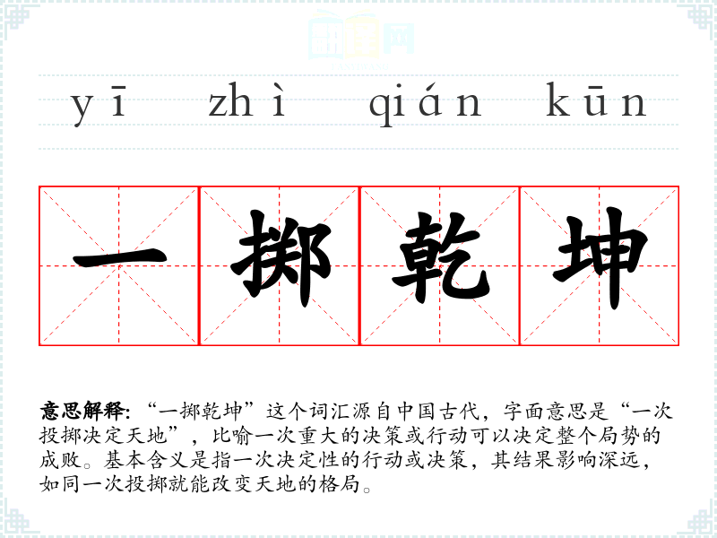 “一掷乾坤”这个词汇源自**古代,字面意思是“一次投掷决定天地”,比喻一次重大的决策或行动可以决定整个局势的成败。基本含义是指一次决定性的行动或决策,其结果影响深远,如同一次投掷就能改变天地的格局。