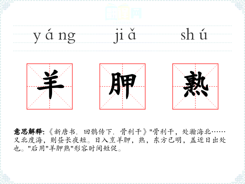 《新唐书.回鹘传下.骨利干》"骨利干,处瀚海北……又北度海,则昼长夜短。日入烹羊胛,熟,东方已明,盖近日出处也。"后用"羊胛熟"形容时间短促。
